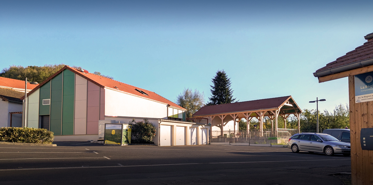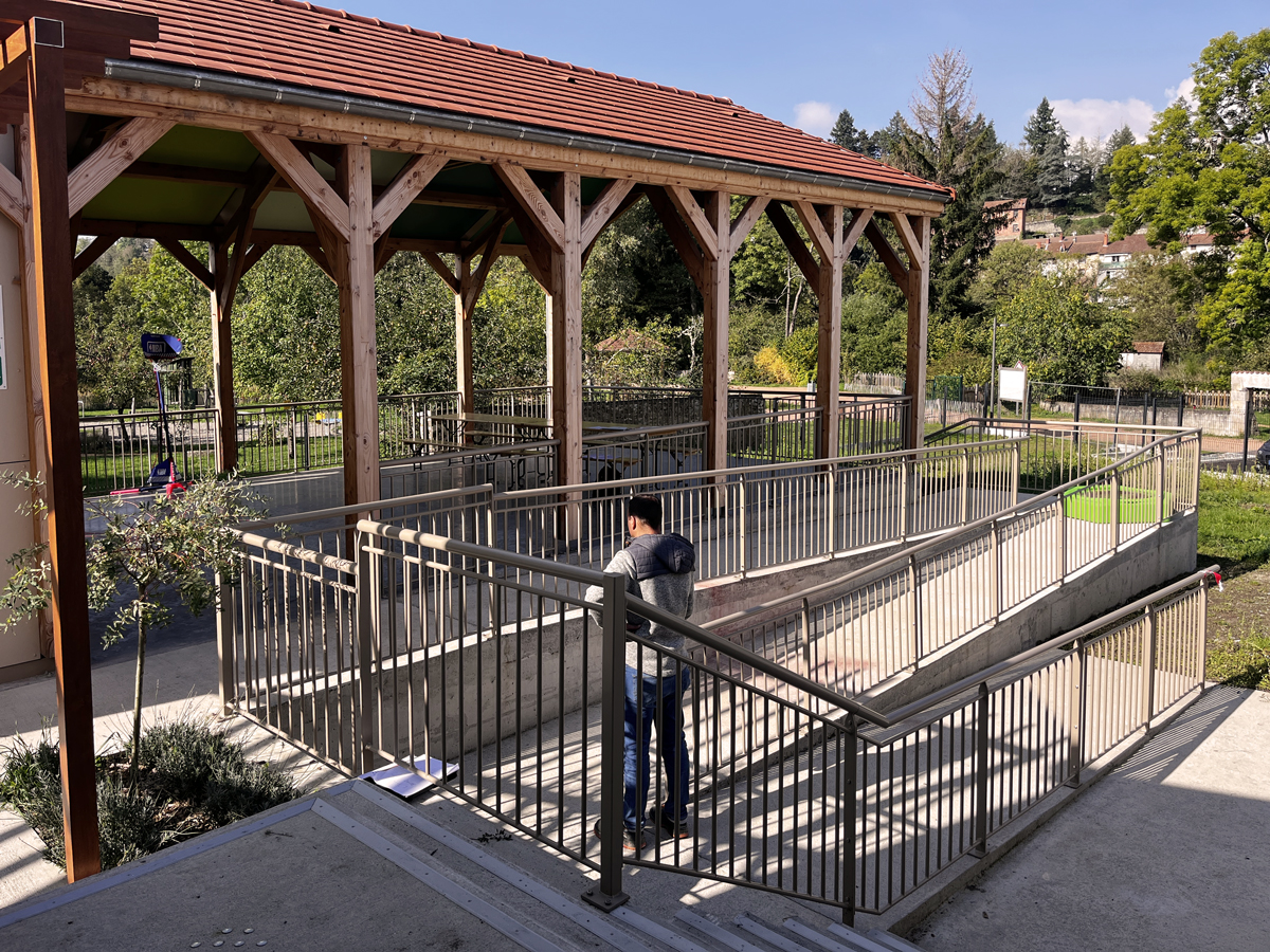 Le préau bois, couvert en tuiles rouges, intègre un local de stockage harmonisé avec l’ensemble. Une rampe PMR reliera les différents niveaux du site aux espaces récréatifs. Enfin, des sanitaires adaptés seront intégrés dans l’immeuble existant pour assurer l’accessibilité à tous les publics.