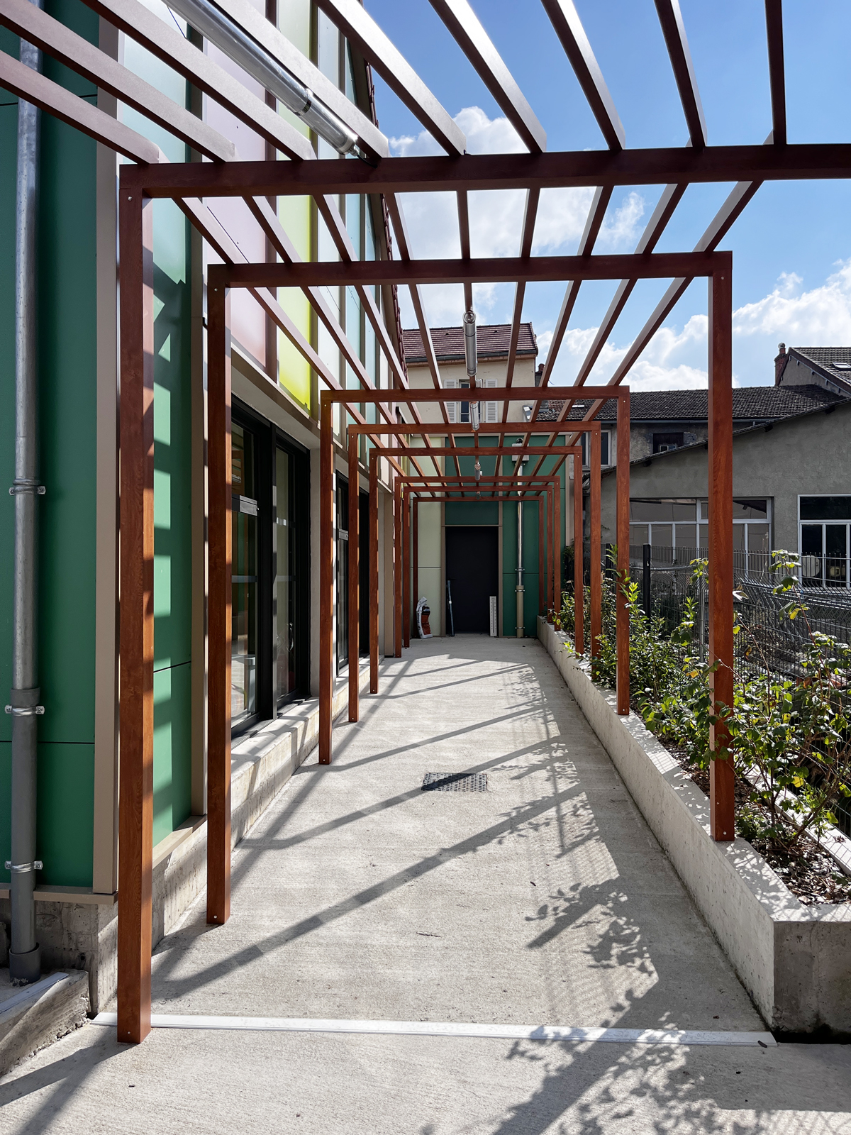 - Un bardage en panneaux Fundermax aux teintes naturelles et vives, posé sur des poteaux aluminium imitation bois ;
