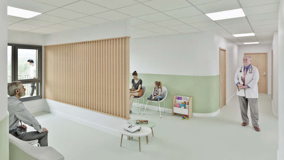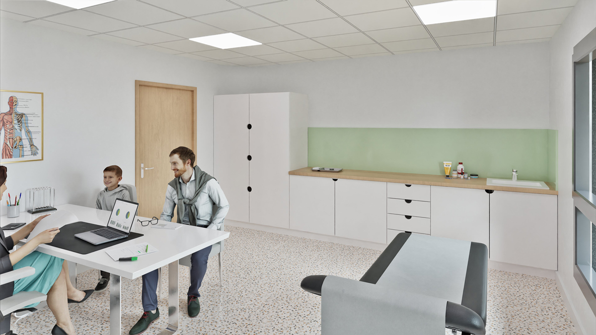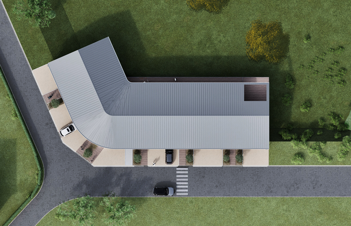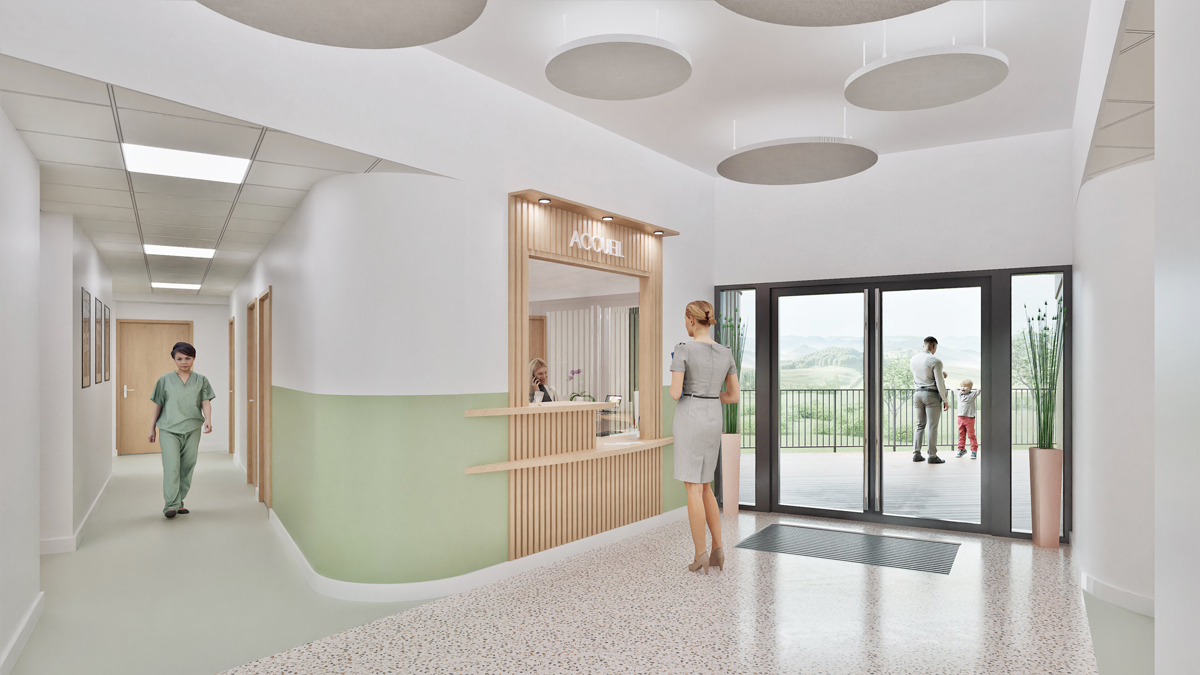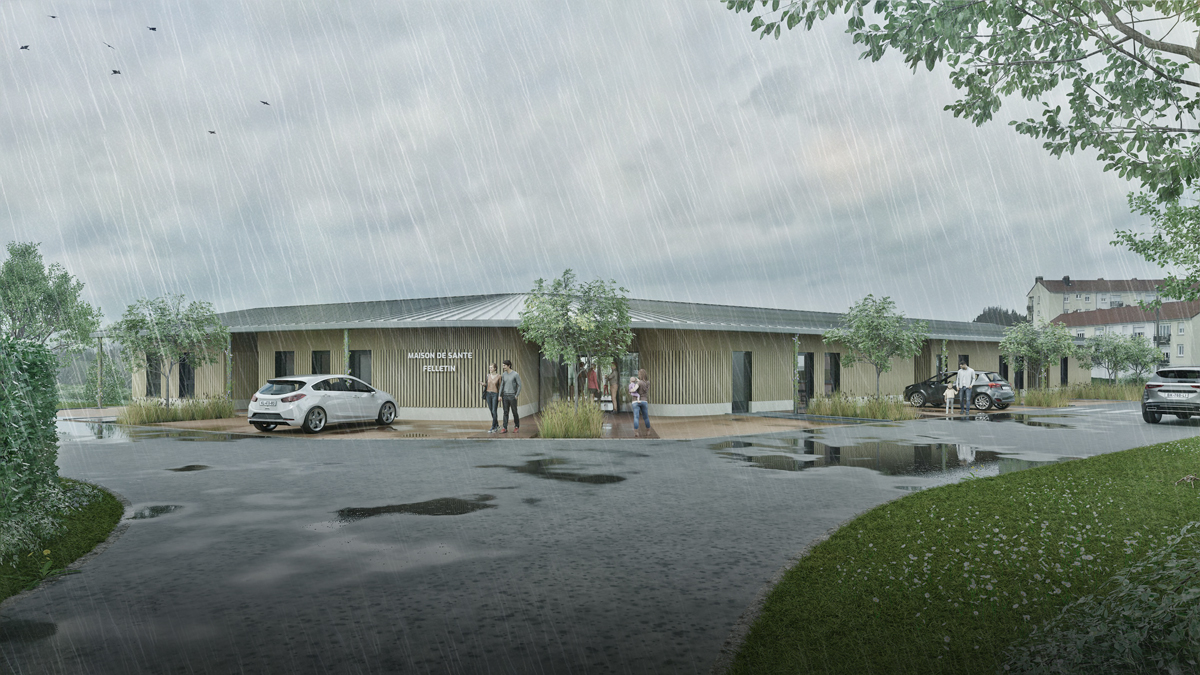 L’aménagement extérieur reste minimaliste, avec un parvis en stabilisé clair, des terrasses végétalisables et 12 places de stationnement, dont 3 PMR. Situé dans un secteur riche en patrimoine bâti protégé, le projet s’insère avec discrétion et sobriété, en dialogue avec les monuments voisins. Il incarne une vision contemporaine, écologique et contextuelle du soin de proximité en territoire rural.